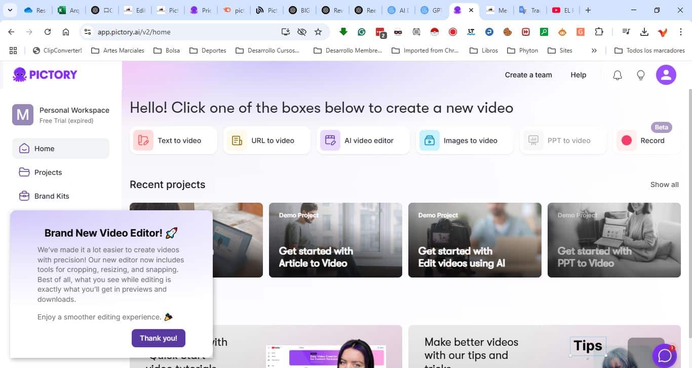 You will now have access to your full Pictory free trial, accompanied by a "Thank You" pop-up.